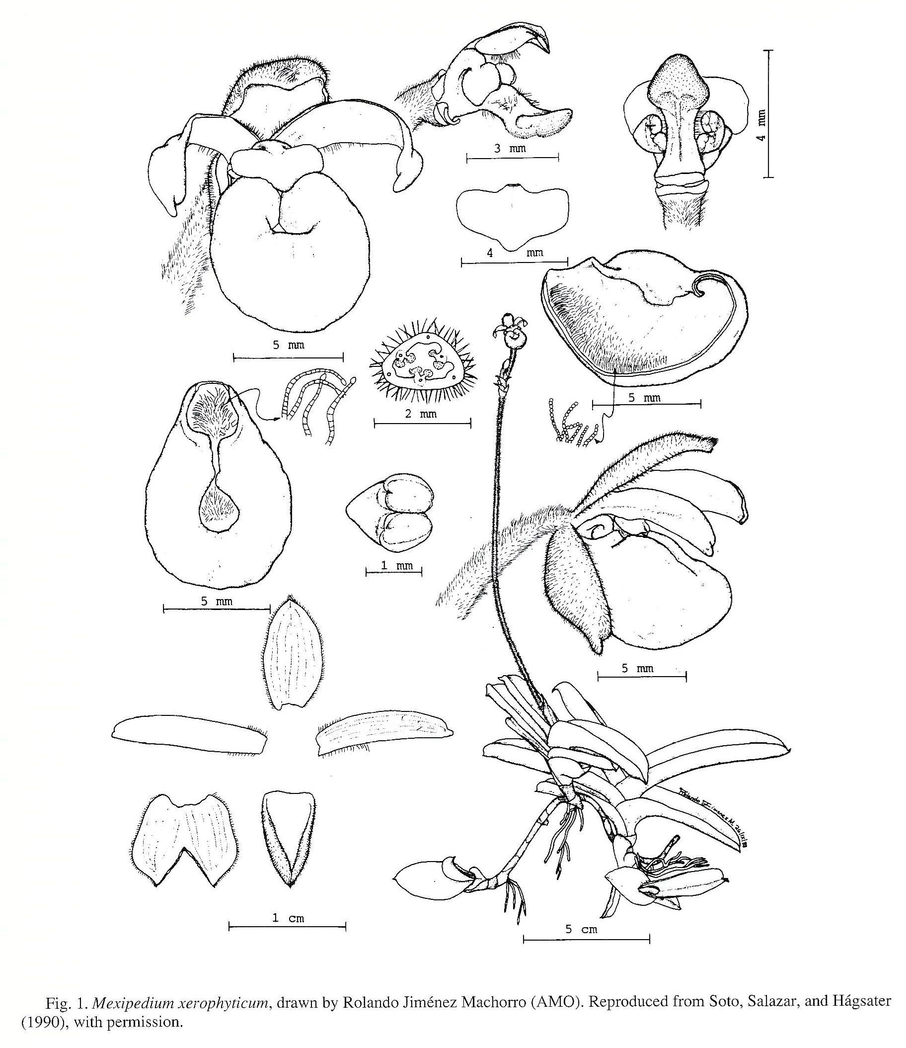 Mexipedium xerophyticum (Soto, Salazar, & Hagsater) V. A. Albert & M. W. Chase, comb. nov. Basionym: Phragmipedium xerophyticum Soto, Salazar, & Hagsater, Orquídea (Méx) 12:2. 1990. TYPE: MEXICO, Oaxaca: selvas de la vertiente del Golfo de México, 320 m s.n.m., vegetación xerofitica de Agave, Beaucarnea, Bursera simaruba, Plumeria y Pseudobombax ellipticum, en zona cárstica rodeada de selva alta perennifolia y encinares tropicales; hierba rupícola, escasa, flares blancas esfumadas de rosa, 6 septiembre 1988, G. A. Salazar 3740, M. A. Soto , E. Yáñez y H. Hernández (Holotype: AMO #11587; Isotype: K; photocopy of holotype seen).