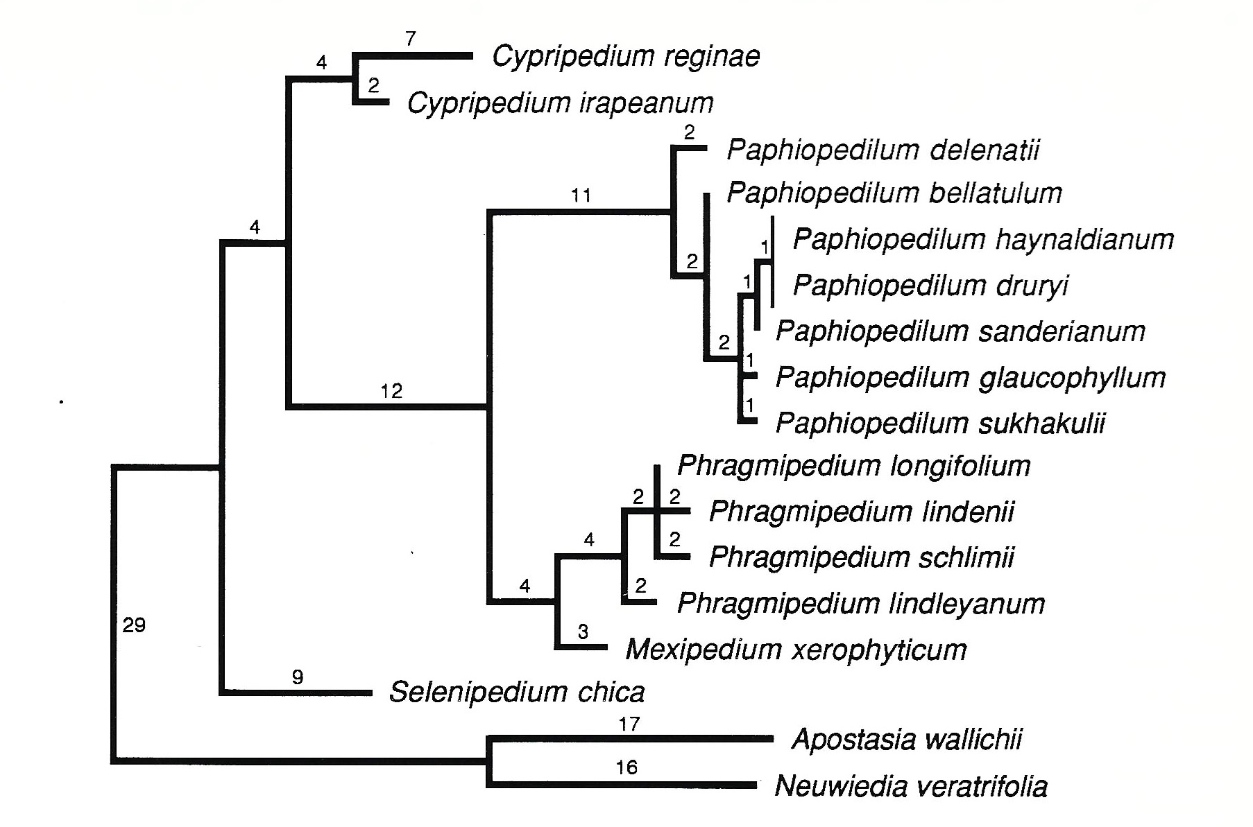 Die Schaffung von Mexipedium stabilisiert sowohl Paphiopedilum als auch Phragmipedium, indem ein Taxon mit einer problematischen Kombination von Merkmalsausprägungen (einkammerige Fruchtknoten, verzweigte Blütenstände und valvate Knospendeckung der Sepalen) separat geführt wird. Diese Entscheidung wird durch eine phylogenetische Analyse der molekularen, anatomischen und morphologischen Daten von Vertretern der fünf hier akzeptierten Gattungen der Frauenschuh-Orchideen unterstützt (V. A. Albert, unpubl.). Cypripedium, Mexipedium, Paphiopedilum, Phragmipedium und Selenipedium sind allesamt monophyletische Taxa (Abb. 2). Der Zweig, der die Gattungen mit längsgefalteten Blättern (Mexipedium, Paphiopedilum und Phragmipedium) verbindet, ist durch zwölf Merkmalsänderungen gut definiert. In ähnlicher Weise ist der Zweig, der Paphiopedilum aus der Alten Welt stützt, durch elf Veränderungen gekennzeichnet. Im Gegensatz dazu wird die Klade der Neuen Welt (Mexipedium und Phragmipedium) durch nur vier Änderungen gestützt, und Phragmipedium selbst durch vier (Abb. 2). Die zusammengesetzte Zweiglänge seit der gemeinsamen Abstammung mit Paphiopedilum beträgt somit acht, was mit den elf Änderungen vergleichbar ist, die diese Gattung stützen. Darüber hinaus weist Mexipedium drei einzigartige Veränderungen (Autapomorphien) auf, die seinem terminalen Zweig zugeordnet sind, was mit den vier Veränderungen vergleichbar ist, die den gesamten Phragmipedium-Stamm definieren (Abb. 2). Diese Muster der Merkmalsunterstützung deuten darauf hin, dass Mexipedium eine beträchtliche morphologische und molekulare Evolution in Isolation von Phragmipedium durchlaufen hat. Dies deckt sich mit seiner biogeografischen Besonderheit als nördlichster Vertreter der Frauenschuh-Orchideen mit längsgefalteten Blättern der Neuen Welt.