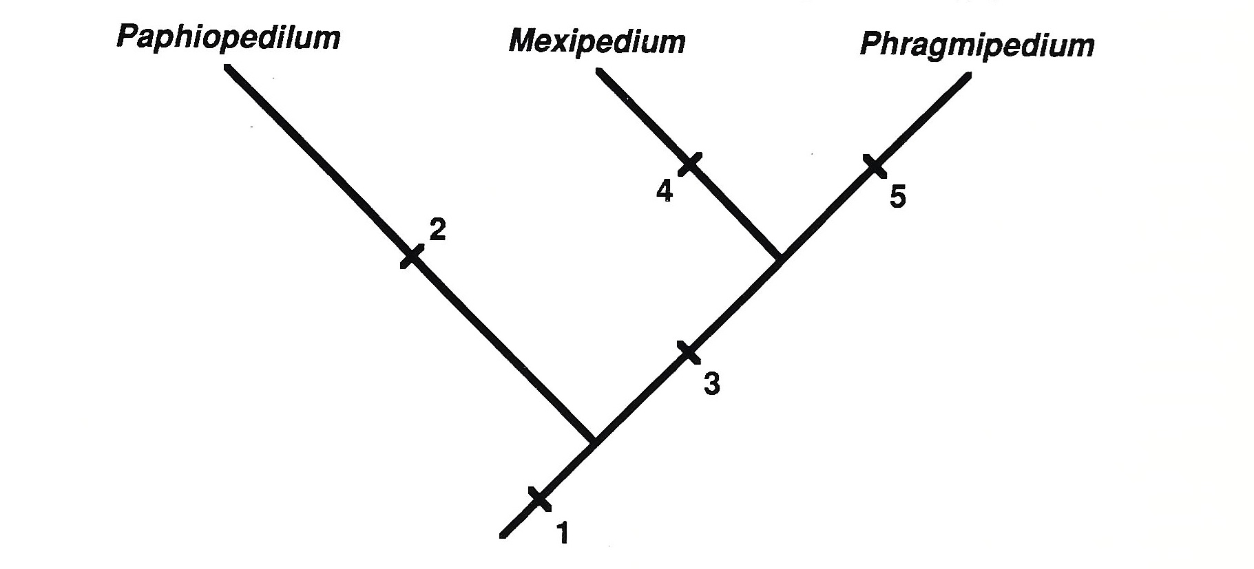 Ein grafischer „Schlüssel“ zu Mexipedium, Paphiopedilum und Phragmipedium wird vorgestellt, wobei die diagnostischen Merkmale den angenommenen Verzweigungsbeziehungen zugeordnet sind (Abb. 3).