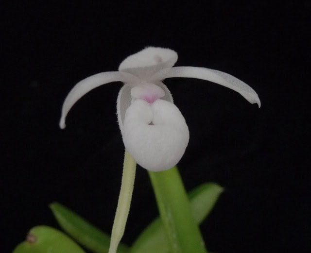 Blüte. Im Verhältnis zur kleinen Pflanze sind auch die nicht duftenden Blüten klein, aber auffällig. Die horizontale Breite der von AOS ausgezeichneten Kultivare reicht von 2,1 cm bis 2,7 cm. (etwa ein Zoll oder geringfügig mehr oder weniger). Die Blüten sind weiss mit einem Hauch von Rosa, vor allem auf der Aussenseite des dorsalen Sepalums und auf dem Staminodium. Die spitz zulaufenden Petalen sind lang, schmal und nach innen gebogen, manchmal mit einer leichten Drehung. Der zarte, abgerundete Schuh hat eingebogene Ränder und ein aufgeblähtes Aussehen. Die einzelnen Blüten halten etwa zwei Wochen.